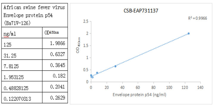CSB-EAP731137 is a solid phase sandwich Enzyme Linked-Immuno-Sorbent Assay (Sandwich ELISA). An antibody specific for African swine fever virus Envelope protein p54 (Ba71V-126) has been pre-coated onto the microwells. The African swine fever virus Envelope protein p54 (Ba71V-126) protein in samples is captured by the coated antibody after incubation. Following extensive washing, another antibody HRP conjugated specific for African swine fever virus Envelope protein p54 (Ba71V-126) is added to detect the captured African swine fever virus Envelope protein p54 (Ba71V-126) protein. Followed by Tetramethyl-benzidine (TMB) reagent. Solution containing sulfuric acid is used to stop color development and the color intensity which is proportional to the quantity of bound protein is measurable at 450nm.