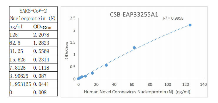 • CSB-EAP33255A1 is a solid phase sandwich Enzyme Linked-Immuno-Sorbent Assay (Sandwich ELISA). An antibody specific for SARS-CoV-2 Nucleoprotein (N) has been pre-coated onto the microwells. The SARS-CoV-2 Nucleoprotein (N) protein in samples is captured by the coated antibody after incubation. Following extensive washing, another antibody HRP conjugated specific for SARS-CoV-2 Nucleoprotein (N) is added to detect the captured SARS-CoV-2 Nucleoprotein (N) protein. Followed by Tetramethyl-benzidine (TMB) reagent. Solution containing sulfuric acid is used to stop color development and the color intensity which is proportional to the quantity of bound protein is measurable at 450nm.