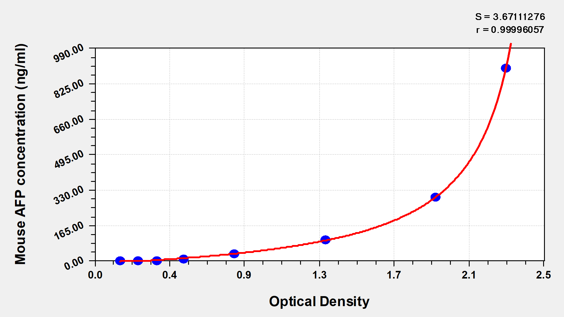 To assess the linearity of the assay, samples were spiked with high concentrations of mouse AFP in various matrices and diluted with the Sample Diluent to produce samples with values within the dynamic range of the assay.