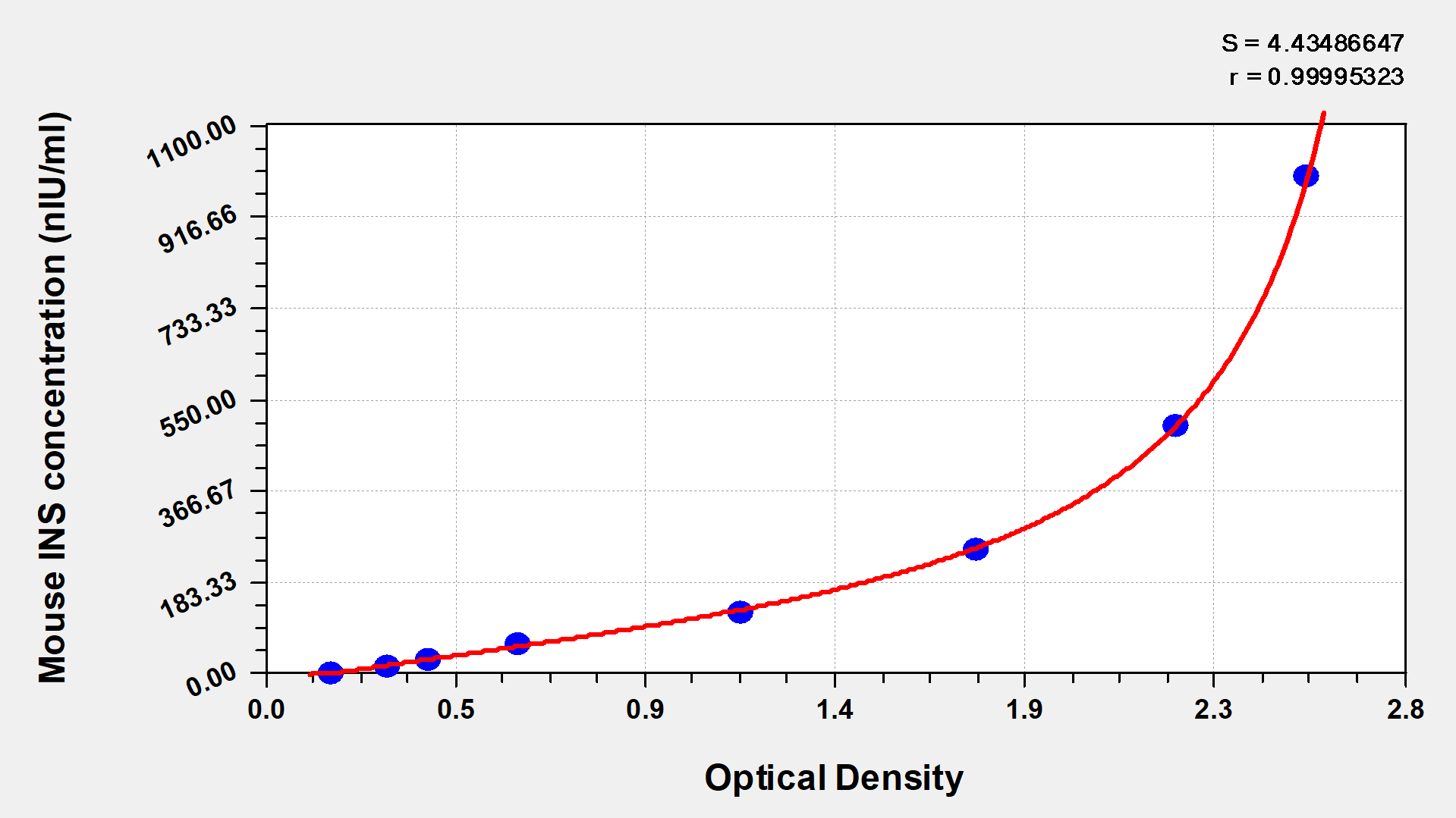 產品評價: 使用Mouse Insulin,INS ELISA Kit檢測小鼠血清中insulin濃度,OD值為0.7813,在標準曲線范圍內,絕對值也符合正常濃度。標曲見附圖