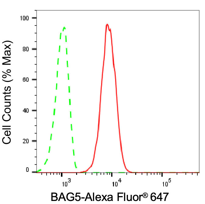 Flow cytometric analysis of BAG5 expression in C2C12 cells using BAG5 antibody. Green, isotype control; red, BAG5.