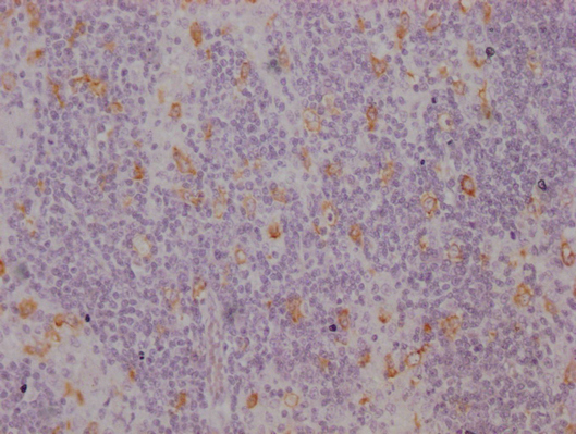 • IHC image of CSB-MA942955 diluted at 1:100 and staining in paraffin-embedded human lymph node tissue performed on a Leica BondTM system. After dewaxing and hydration, antigen retrieval was mediated by high pressure in a citrate buffer (pH 6.0). Section was blocked with 10% normal goat serum 30min at RT. Then primary antibody (1% BSA) was incubated at 4°C overnight. The primary is detected by a Goat anti-mouse IgG polymer labeled by HRP and visualized using 0.05% DAB.