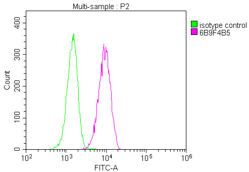 Overlay histogram showing Hela cells stained with CSB-MA004960A1m (red line) at 1:200. The cells were fixed in 4% formaldehyde and permeated by 0.2% TritonX-100. Then 10% normal goat serum was Incubated to block non-specific protein-protein interactions followed by the antibody (1μg/1*106cells) for 1 h at 4°C. The secondary antibody used was FITC-conjugated Goat Anti-Mouse IgG(H+L) at 1/100 dilution for 30min at 4°C. Isotype control antibody (green line) was mouse IgG1 (1μg/1*106cells) used under the same conditions. Acquisition of >10,000 events was performed.