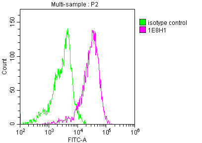 Overlay histogram showing Jurkat cells stained with CSB-MA004969A1m (red line) at 1:100. The cells were fixed in 4% formaldehyde and permeated by 0.2% TritonX-100. Then 10% normal goat serum was Incubated to block non-specific protein-protein interactions followed by the antibody (1μg/1*106cells) for 1 h at 4°C. The secondary antibody used was FITC-conjugated Goat Anti-Mouse IgG(H+L) at 1/100 dilution for 30min at 4°C. Isotype control antibody (green line) was mouse IgG1(1μg/1*106cells) used under the same conditions. Acquisition of >10,000 events was performed.