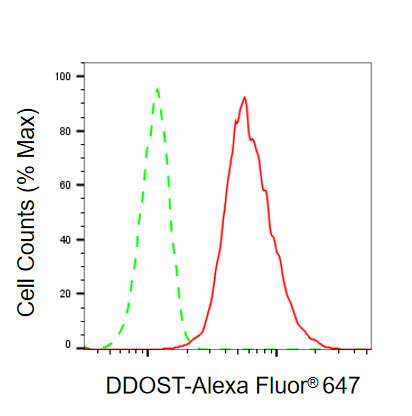 Flow cytometric analysis of DDOST expression in C2C12 cells using DDOST antibody. Green, isotype control; red, DDOST.