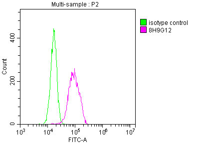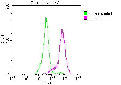 Overlay histogram showing MCF-7 cells stained with CSB-MA007670A0m (red line) at 1:260. The cells were incubated in 1x PBS /10% normal goat serum to block non-specific protein-protein interactions followed by primary antibody for 1 h at 4°C. The secondary antibody used was FITC goat anti-mouse IgG(H+L) at 1/200 dilution for 1 h at 4°C. Isotype control antibody (green line) was used under the same conditions. Acquisition of >10,000 events was performed.