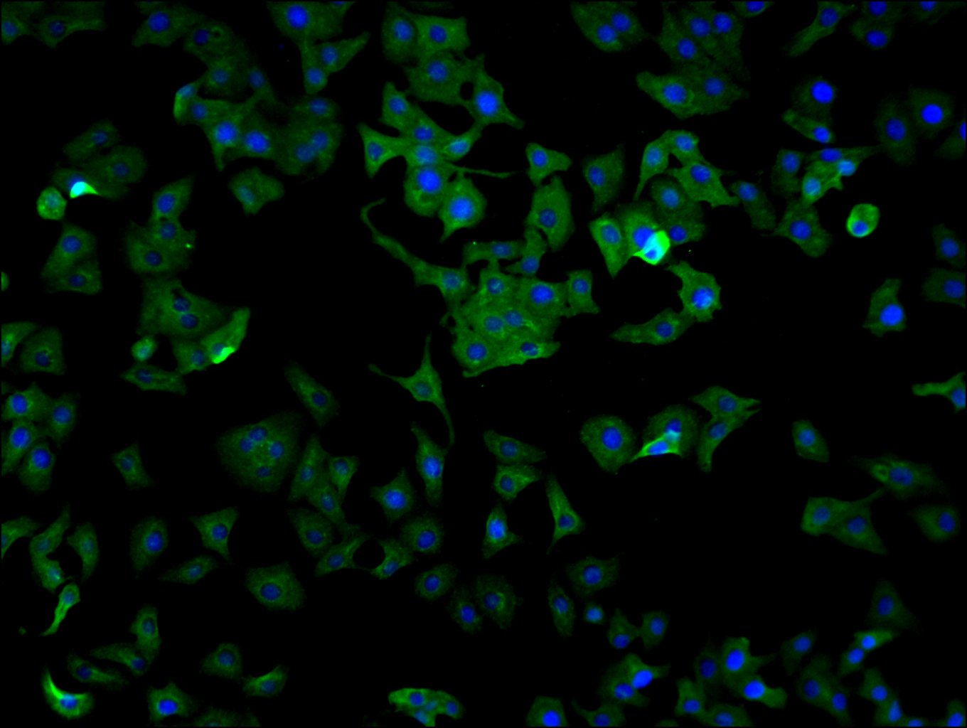 Immunofluorescence staining of Hela cells with CSB-MA007670A0m at 1:130, counter-stained with DAPI. The cells were blocked in 10% normal Goat Serum and then incubated with the primary antibody overnight at 4°C. The secondary antibody was Alexa Fluor 488-congugated AffiniPure Goat Anti-Mouse IgG(H+L).