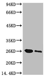 • Western blot analysis of GFP transfected Hela, diluted at 1) 1:5000 2) 1:10000