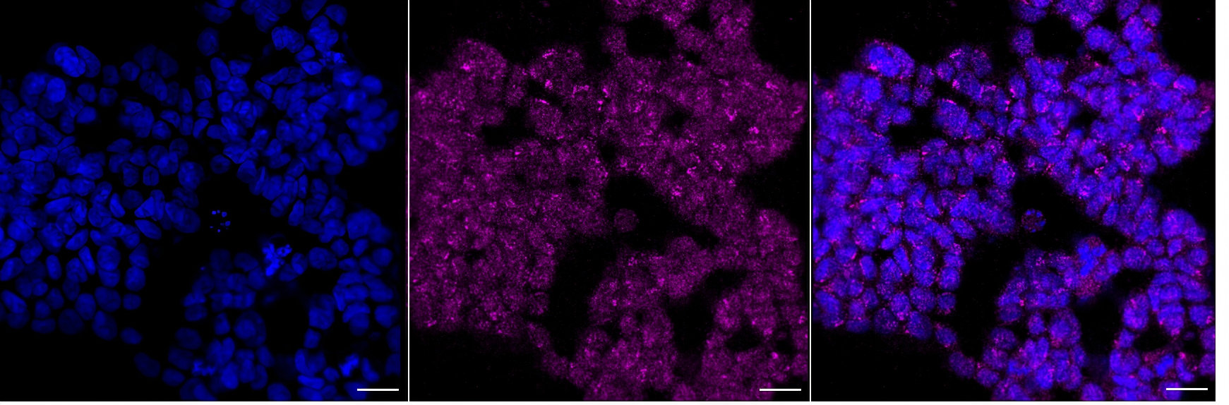 • Immunocytochemical staining of HAP1 cells with Lysine demethylase 3A antibody. Nuclei were stained blue with DAPI; Lysine demethylase 3A was stained magenta with Alexa Fluor? 647. Images were taken using Leica stellaris 5. Protein abundance based on laser Intensity and smart gain: Low. Scale bar, 20 μm.