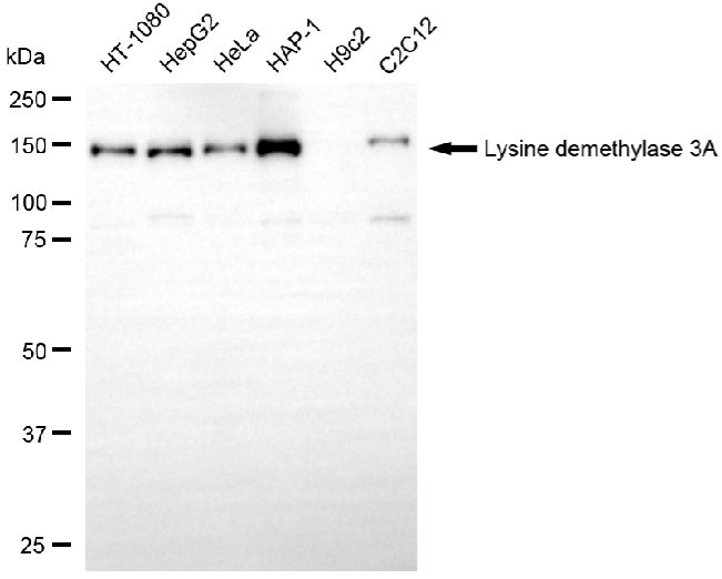 • Western blotting analysis using lysine demethylase 3A antibody. Total cell lysates (30 μg) from various cell lines were loaded and separated by SDS-PAGE. The blot was incubated with lysine demethylase 3A antibody and HRP-conjugated goat anti-mouse secondary antibody respectively.