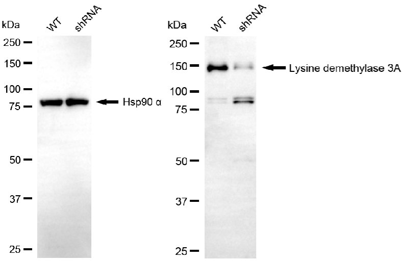• Western blotting analysis using lysine demethylase 3A antibody. Lysine demethylase 3A expression in wild-type (WT) and lysine demethylase 3A (KDM3A) shRNA knockdown (KD) HeLa cells with 20 μg of total cell lysates. Hsp90 α serves as a loading control. The blot was incubated with lysine demethylase 3A antibody and HRP-conjugated goat anti-mouse secondary antibody respectively.