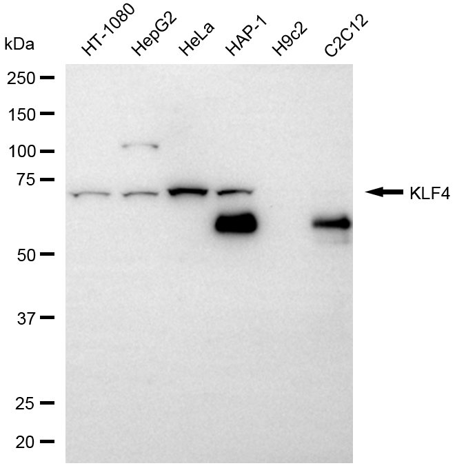Western blotting analysis using KLF4 antibody. Total cell lysates (30 μg) from various cell lines were loaded and separated by SDS-PAGE. The blot was incubated with KLF4 antibody and HRP-conjugated goat anti-mouse secondary antibody respectively.