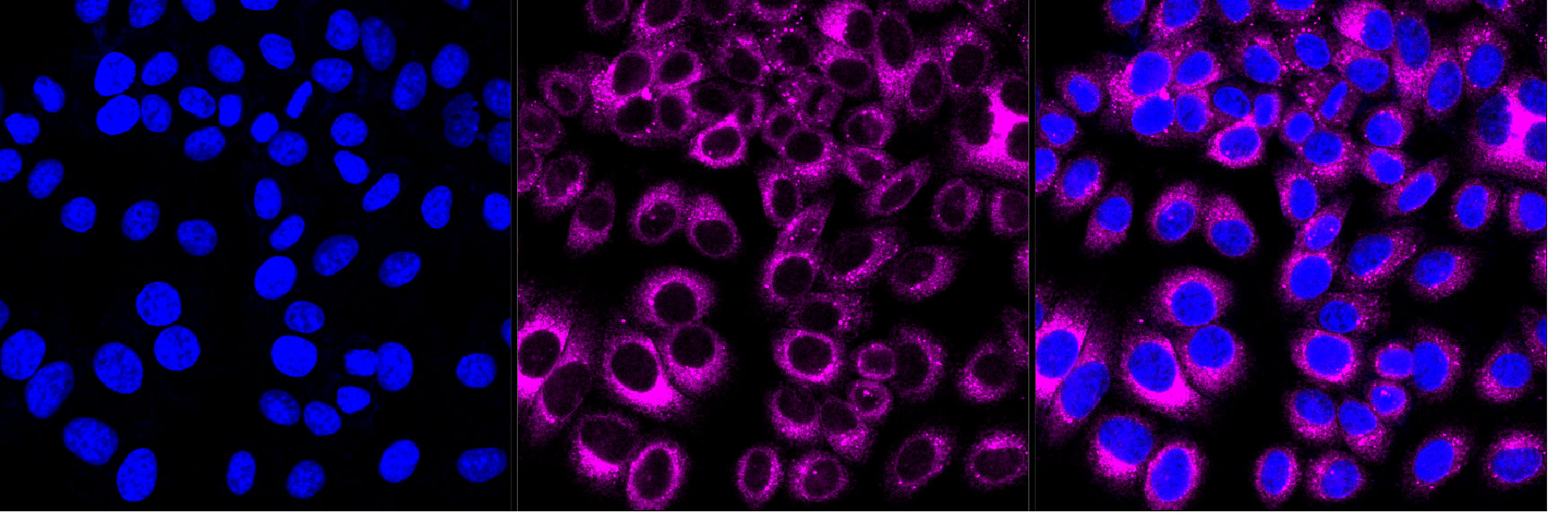 Immunocytochemical staining of HepG2 cells with P4HB antibody. Nuclei were stained blue with DAPI; P4HB was stained magenta with Alexa Fluor? 647. Images were taken using Leica stellaris 5. Protein abundance based on laser Intensity and smart gain: Medium. Scale bar, 20 μm.