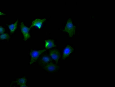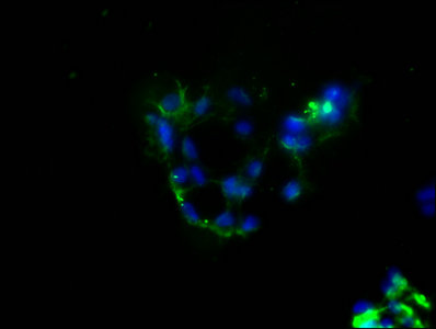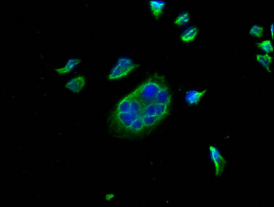 • Immunofluorescence staining of 293 cells with CSB-MA878942A0m at 1:100, counter-stained with DAPI. The cells were blocked in 10% normal Goat Serum and then incubated with the primary antibody overnight at 4°C. The secondary antibody was Alexa Fluor 488-congugated AffiniPure Goat Anti-Mouse IgG(H+L).