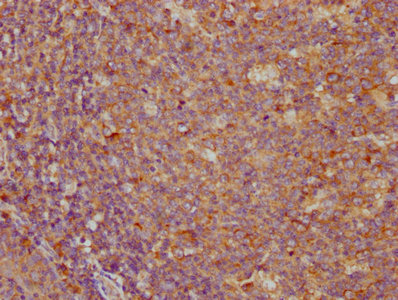 • IHC image of CSB-MA878942A0m diluted at 1:100 and staining in paraffin-embedded human tonsil tissue performed on a Leica BondTM system. After dewaxing and hydration, antigen retrieval was mediated by high pressure in a citrate buffer (pH 6.0). Section was blocked with 10% normal goat serum 30min at RT. Then primary antibody (1% BSA) was incubated at 4°C overnight. The primary is detected by a biotinylated secondary antibody and visualized using an HRP conjugated SP system.