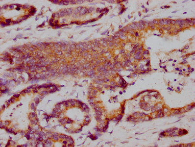 • IHC image of CSB-MA878942A0m diluted at 1:100 and staining in paraffin-embedded human colon cancer performed on a Leica BondTM system. After dewaxing and hydration, antigen retrieval was mediated by high pressure in a citrate buffer (pH 6.0). Section was blocked with 10% normal goat serum 30min at RT. Then primary antibody (1% BSA) was incubated at 4°C overnight. The primary is detected by a biotinylated secondary antibody and visualized using an HRP conjugated SP system.