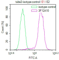 Overlay Peak curve showing HepG2 cells stained with CSB-MA010418PA28ph02HU (red line) at 1:100. The cells were incubated in 10% normal goat serum to block non-specific protein-protein interactions followed by the antibody (1μg/1*106cells) for 1h at 4°C. The secondary antibody used was FITC-conjugated Goat Anti-Mouse IgG(H+L) at 1/100 dilution for 30min at 4°C. Isotype control antibody (green line) was mouse IgG1 (1μg/1*106cells) used under the same conditions. Acquisition of >10,000 events was performed.
