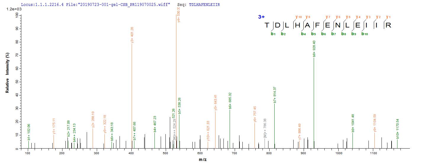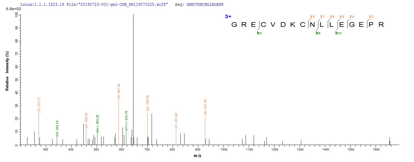 Based on the SEQUEST from database of Mammalian Cell host and target protein, the LC-MS/MS Analysis result of CSB-MP007479HU could indicate that this peptide derived from Mammalian Cell-expressed Homo sapiens (Human) EGFR.