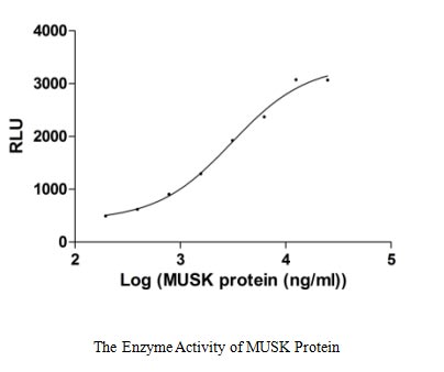 Recombinant Human Muscle, skeletal receptor tyrosine-protein kinase(MUSK) is a partial-length active protein expressed in vitro E.coli expression system. This protein contains the extracellular domain (24-495aa) of human MUSK and carries an N-terminal 6xHis-tag. Its purity is greater than 90% as determined by SDS-PAGE. And its bio-activity was measured and confirmed through the ADP-Glo Kinase detection kit. The EC50 of MUSK is 2.65-3.58 μg/ml. The recombinant MUSK protein can be used for specific antibody production. Besides, it may find uses in the studies of MUSK-related signal transduction.