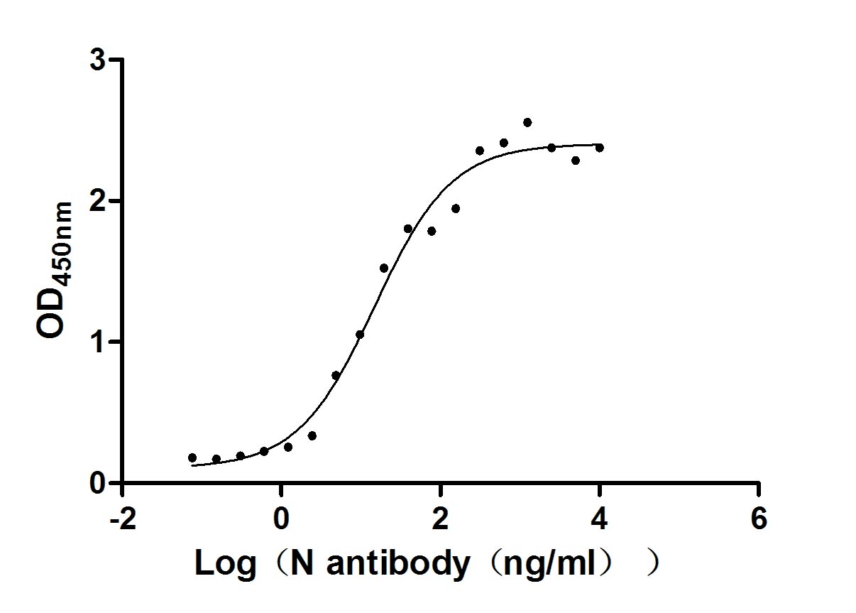 Measured by its binding ability in a functional ELISA. Immobilized N (CSB-EP3325GMY(M3)) at 2 μg/ml can bind N Recombinant Antibody(CSB-RA33255A1GMY), the EC50 of N Recombinant Antibody is 63.78-113.6 ng/ml. Biological Activity Assay