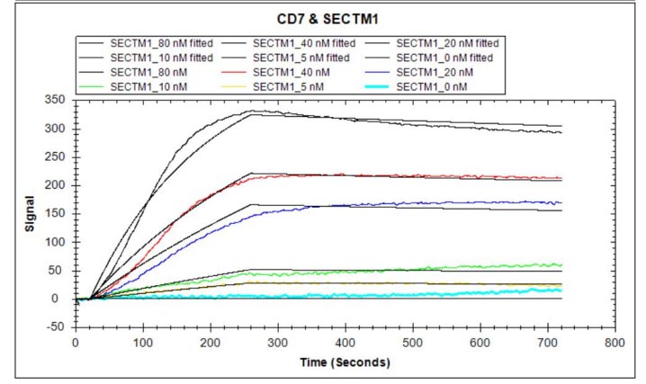 Human CD7 protein hFc and Myc tag (CSB-MP004953HU) captured on COOH chip can bind Human SECTM1 protein hFc tag (CSB-MP819898HU) with an affinity constant of 1.84 nM as detected by LSPR Assay. Biological Activity Assay -