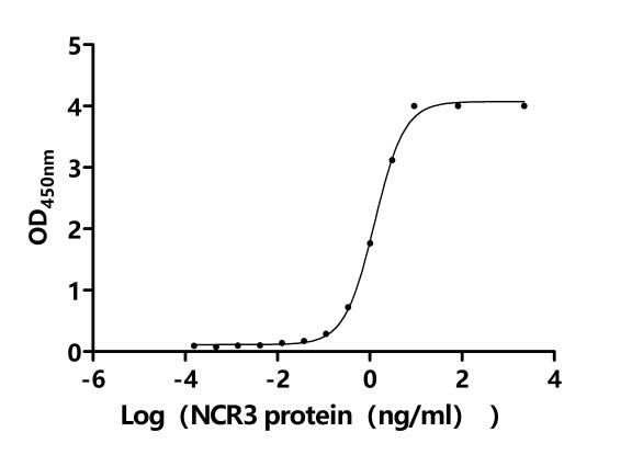 Measured by its binding ability in a functional ELISA. Immobilized Macaca fascicularis NCR3LG1 at 5 μg/ml on an Nickel Coated plate can bind Macaca fascicularis NCR3(CSB-MP015551MOV1j8). The EC50 is 1.171-1.377 ng/mL. Biological Activity Assay -