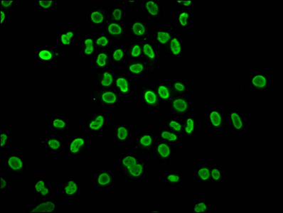 Immunofluorescence staining of Hela cells (treated with 30mM sodium butyrate for 4h) with CSB-PA010429OA05hibHU at 1:40, counter-stained with DAPI. The cells were fixed in 4% formaldehyde, permeabilized using 0.2% Triton X-100 and blocked in 10% normal Goat Serum. The cells were then incubated with the antibody overnight at 4°C. The secondary antibody was Alexa Fluor 488-congugated AffiniPure Goat Anti-Rabbit IgG(H+L).
