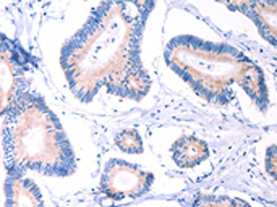 • The image on the left is immunohistochemistry of paraffin-embedded Human colon cancer tissue using CSB-PA928876(AADAC Antibody) at dilution 1/30, on the right is treated with fusion protein. (Original magnification: ×200)