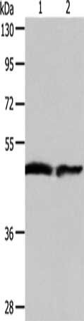 • Gel: 10%SDS-PAGE, Lysate: 40 μg, Lane 1-2: Human fetal liver tissue, Human liver cancer tissue, Primary antibody: CSB-PA928876(AADAC Antibody) at dilution 1/550, Secondary antibody: Goat anti rabbit IgG at 1/8000 dilution, Exposure time: 1 minute