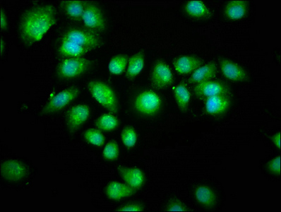 Immunofluorescence staining of A549 cells with CSB-PA623090LA01HU at 1:133, counter-stained with DAPI. The cells were fixed in 4% formaldehyde, permeabilized using 0.2% Triton X-100 and blocked in 10% normal Goat Serum. The cells were then incubated with the antibody overnight at 4°C. The secondary antibody was Alexa Fluor 488-congugated AffiniPure Goat Anti-Rabbit IgG(H+L).