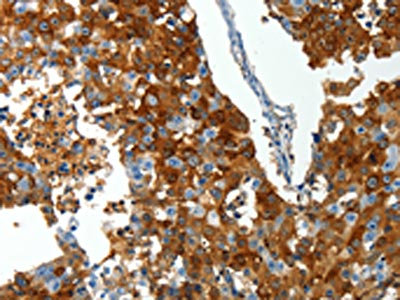 The image on the left is immunohistochemistry of paraffin-embedded Human breast cancer tissue using CSB-PA139278(ABCG1 Antibody) at dilution 1/25, on the right is treated with synthetic peptide. (Original magnification: ×200)