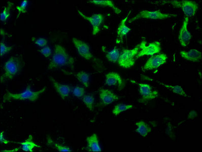 Immunofluorescence staining of U251 cells with CSB-PA001268EA01HU at 1:160,counter-stained with DAPI. The cells were fixed in 4% formaldehyde, permeabilized using 0.2% Triton X-100 and blocked in 10% normal Goat Serum. The cells were then incubated with the antibody overnight at 4°C.The secondary antibody was Alexa Fluor 488-congugated AffiniPure Goat Anti-Rabbit IgG (H+L).