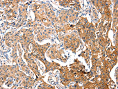The image on the left is immunohistochemistry of paraffin-embedded Human lung cancer tissue using CSB-PA776767(ADA Antibody) at dilution 1/15, on the right is treated with fusion protein. (Original magnification: ×200)