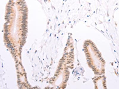 The image on the left is immunohistochemistry of paraffin-embedded Human colon cancer tissue using CSB-PA083402(ADAM12 Antibody) at dilution 1/30, on the right is treated with synthetic peptide. (Original magnification: ×200)