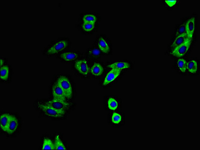Immunofluorescent analysis of HepG2 cells using CSB-PA001275LA01HU at dilution of 1:100 and Alexa Fluor 488-congugated AffiniPure Goat Anti-Rabbit IgG(H+L)