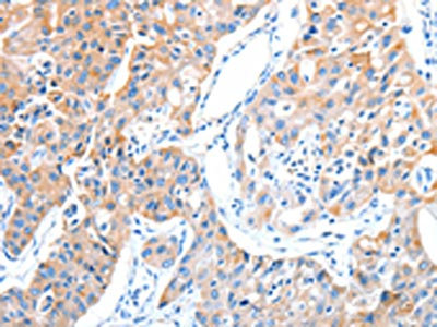 • The image on the left is immunohistochemistry of paraffin-embedded Human lung cancer tissue using CSB-PA261035(ADAM17 Antibody) at dilution 1/15, on the right is treated with fusion protein. (Original magnification: ×200)