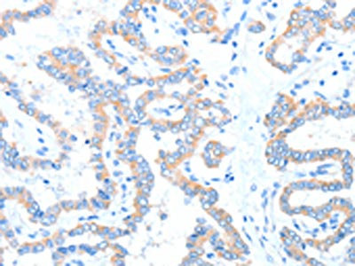• The image on the left is immunohistochemistry of paraffin-embedded Human thyroid cancer tissue using CSB-PA261035(ADAM17 Antibody) at dilution 1/15, on the right is treated with fusion protein. (Original magnification: ×200)