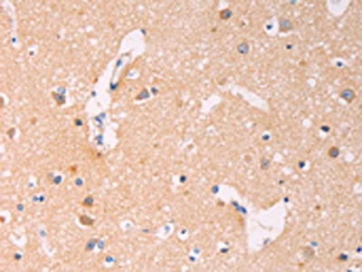 • The image on the left is immunohistochemistry of paraffin-embedded Human brain tissue using CSB-PA901817(ADCY1 Antibody) at dilution 1/60, on the right is treated with synthetic peptide. (Original magnification: ×200)