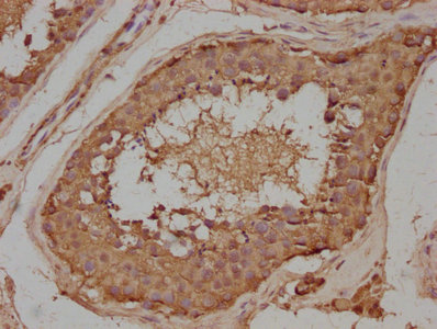 IHC image of CSB-PA839393LA01HU diluted at 1:100 and staining in paraffin-embedded human testis tissue performed on a Leica BondTM system. After dewaxing and hydration, antigen retrieval was mediated by high pressure in a citrate buffer (pH 6.0). Section was blocked with 10% normal goat serum 30min at RT. Then primary antibody (1% BSA) was incubated at 4°C overnight. The primary is detected by a biotinylated secondary antibody and visualized using an HRP conjugated SP system.