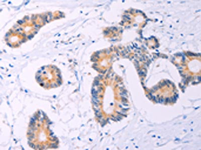 • The image on the left is immunohistochemistry of paraffin-embedded Human colon cancer tissue using CSB-PA942397(ADCY5 Antibody) at dilution 1/30, on the right is treated with synthetic peptide. (Original magnification: ×200)