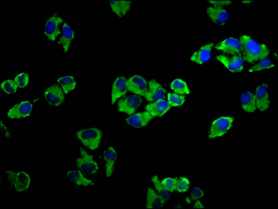 • Immunofluorescence staining of Hela cells with CSB-PA001341LA01HU at 1:33, counter-stained with DAPI. The cells were fixed in 4% formaldehyde, permeabilized using 0.2% Triton X-100 and blocked in 10% normal Goat Serum. The cells were then incubated with the antibody overnight at 4°C. The secondary antibody was Alexa Fluor 488-congugated AffiniPure Goat Anti-Rabbit IgG(H+L).