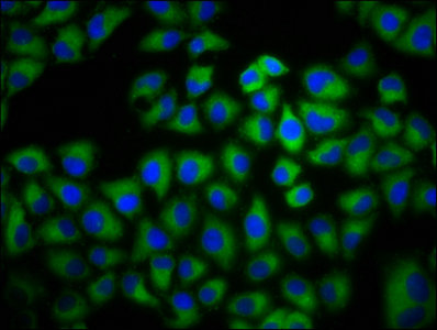 • Immunofluorescence staining of Hela cells with CSB-PA001342LA01HU at 1:133, counter-stained with DAPI. The cells were fixed in 4% formaldehyde, permeabilized using 0.2% Triton X-100 and blocked in 10% normal Goat Serum. The cells were then incubated with the antibody overnight at 4°C. The secondary antibody was Alexa Fluor 488-congugated AffiniPure Goat Anti-Rabbit IgG(H+L).
