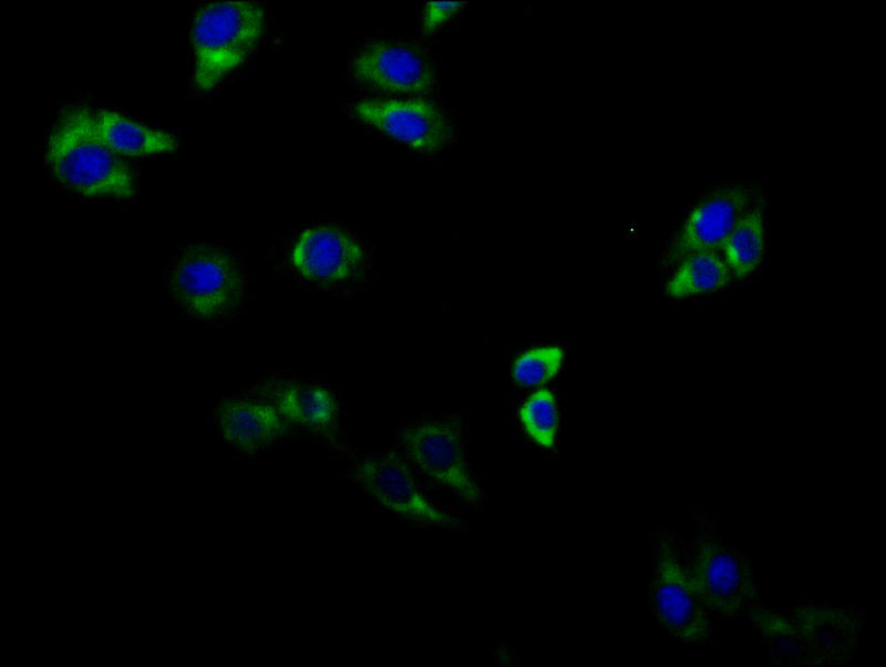 Immunofluorescent analysis of HepG2 cells using CSB-PA001377LA01HU at dilution of 1:100 and Alexa Fluor 488-congugated AffiniPure Goat Anti-Rabbit IgG(H+L)