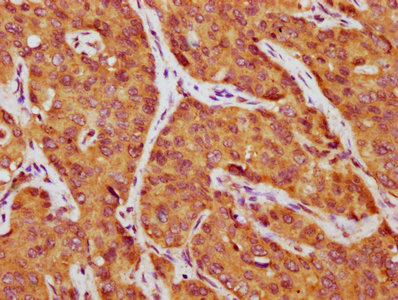 IHC image of CSB-PA09987A0Rb diluted at 1:750 and staining in paraffin-embedded human liver cancer performed on a Leica BondTM system. After dewaxing and hydration, antigen retrieval was mediated by high pressure in a citrate buffer (pH 6.0). Section was blocked with 10% normal goat serum 30min at RT. Then primary antibody (1% BSA) was incubated at 4°C overnight. The primary is detected by a biotinylated secondary antibody and visualized using an HRP conjugated SP system.