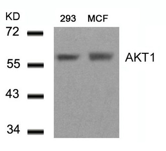 Western blot analysis of extracts from 293 and MCF cells using AKT1(Ab-450) Antibody.