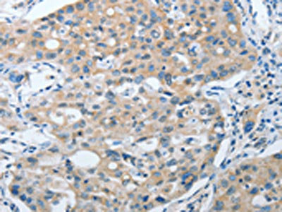 The image on the left is immunohistochemistry of paraffin-embedded Human liver cancer tissue using CSB-PA906762(ANAPC13 Antibody) at dilution 1/25, on the right is treated with fusion protein. (Original magnification: ×200)