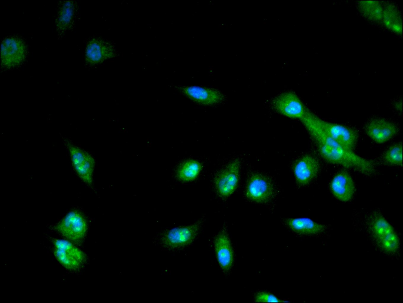 Immunofluorescence staining of A431 cell with 5% goat serum, counter-stained with DAPI. The cells were fixed in 4% formaldehyde and blocked in 10% normal Goat Serum. The cells were then incubated with the antibody overnight at 4C. The secondary antibody was Alexa Fluor 488-congugated AffiniPure Goat Anti-Rabbit IgG(H+L).