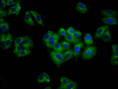 • Immunofluorescence staining of HepG2 cells with CSB-PA679761LA01HU at 1:100, counter-stained with DAPI. The cells were fixed in 4% formaldehyde, permeabilized using 0.2% Triton X-100 and blocked in 10% normal Goat Serum. The cells were then incubated with the antibody overnight at 4°C. The secondary antibody was Alexa Fluor 488-congugated AffiniPure Goat Anti-Rabbit IgG(H+L).