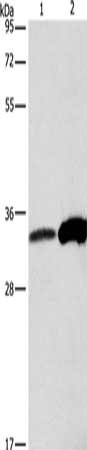 Gel: 8%SDS-PAGE, Lysate: 40 μg, Lane 1-2: Raw264.7 cells, human fetal liver tissue, Primary antibody: CSB-PA696568(ANXA4 Antibody) at dilution 1/500, Secondary antibody: Goat anti rabbit IgG at 1/8000 dilution, Exposure time: 3 seconds