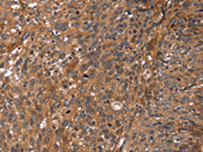 The image on the left is immunohistochemistry of paraffin-embedded Human cervical cancer tissue using CSB-PA043863(APAF1 Antibody) at dilution 1/40, on the right is treated with synthetic peptide. (Original magnification: ×200)